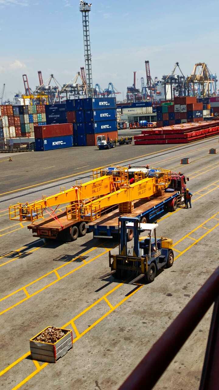 Di tengah hiruk pikuk aktivitas terminal peti kemas, kami menjalankan tugas stevedoring untuk kargo konstruksi berbobot tinggi. Komponen struktur baja seperti spreader beam diturunkan langsung dari kapal dan ditempatkan ke atas truk dengan manuver yang cermat.