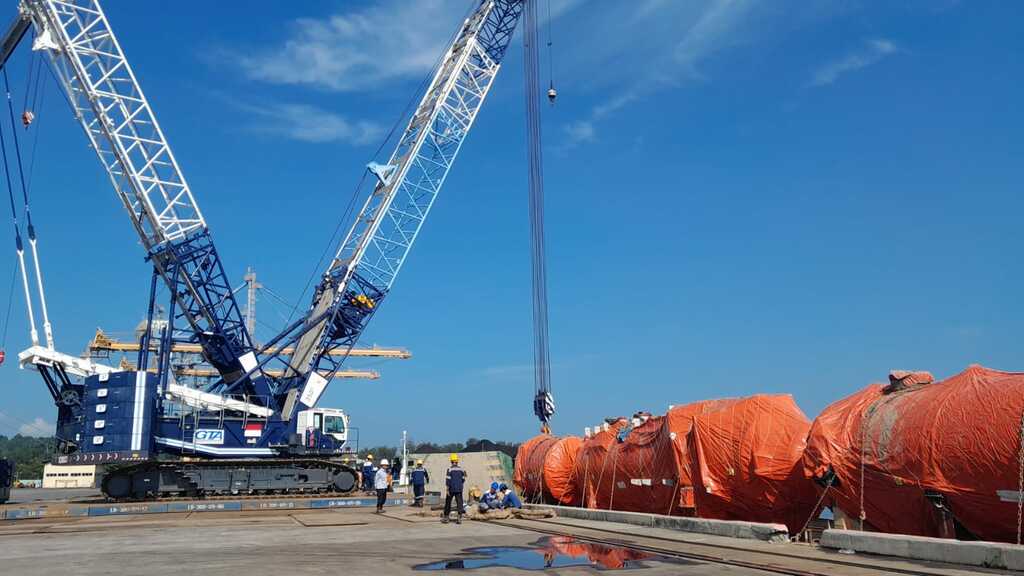 Pada gambar ini, tim kami tengah melakukan penanganan muatan proyek berukuran besar menggunakan crawler crane berkapasitas tinggi. Kargo dengan dimensi ekstra dilindungi dengan wrapping khusus untuk menjamin integritas saat proses bongkar muat. Operasi berlangsung di pelabuhan dengan pengawasan ketat oleh tenaga ahli bersertifikat dan prosedur K3 yang ketat.